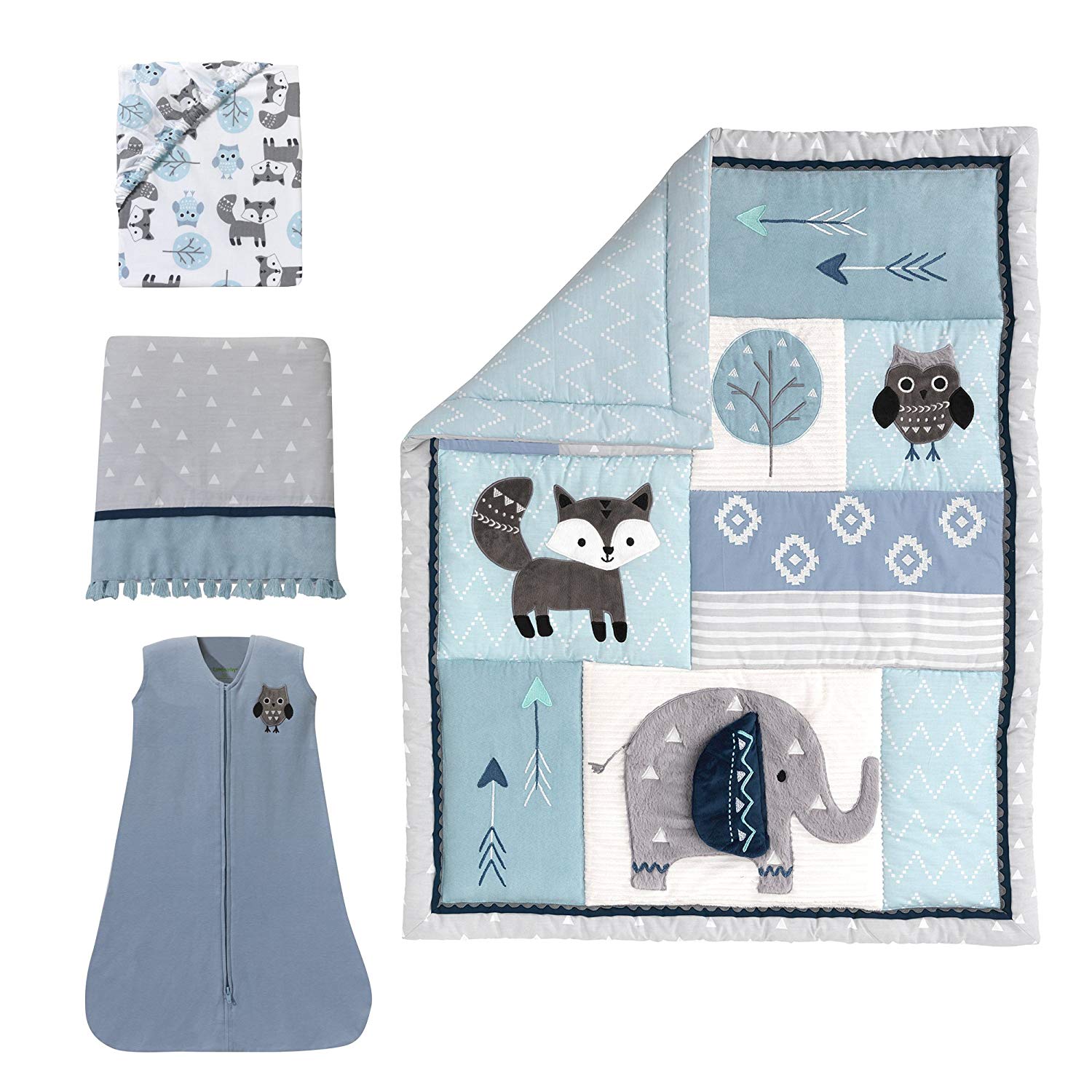 Transform your nursery into a cozy woodland retreat with this charming four-piece crib bedding set. Featuring adorable forest friends—elephant, fox, and owl—each piece brings personality and comfort to baby's sleep space. The quilted coverlet showcases mixed textures, playful embroidery, and geometric patterns including arrows and chevrons. The 100% cotton fitted sheet (fits 28" x 52" mattresses) displays a sweet parade of foxes, owls, and trees in soft grays. The coordinating dust ruffle blends gray triangles with slate blue accents and tassel trim for a polished look. Complete the set with the matching Snuggle Sleeper for extra snuggles and style.