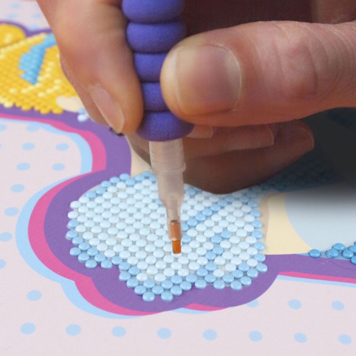 The unique Camelot Dots Diamond Painting Kits offer a blend of classic and licensed designs from your favorite brands. Intermediate Disney Pow-Er Dotz Cinderella Kind- A colorful twist on paint by numbers using multi-facet dots. Complete your diamond painting Kit and immediately display it with the convenient built-in hang hole on the back. Features Cinderella surrounded by polka dots, stars, hearts, a shoe, and her name. Includes: high quality color printed fabric, gems sorted by shade, craft tray, stylus, soft grip and wax. Measures approximately 11"x 11".