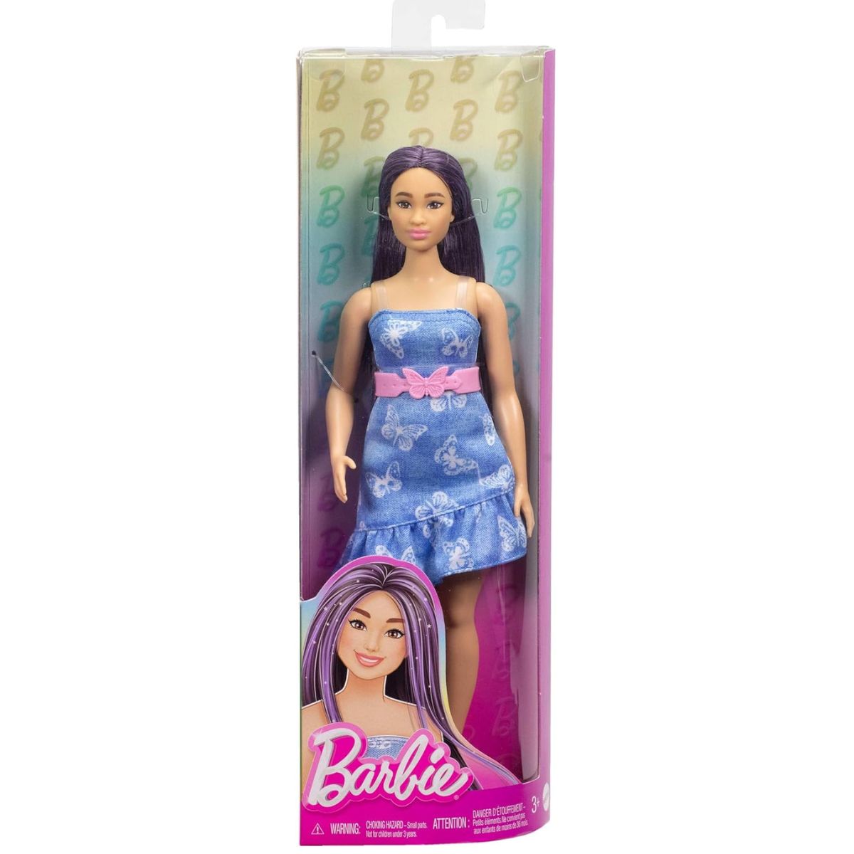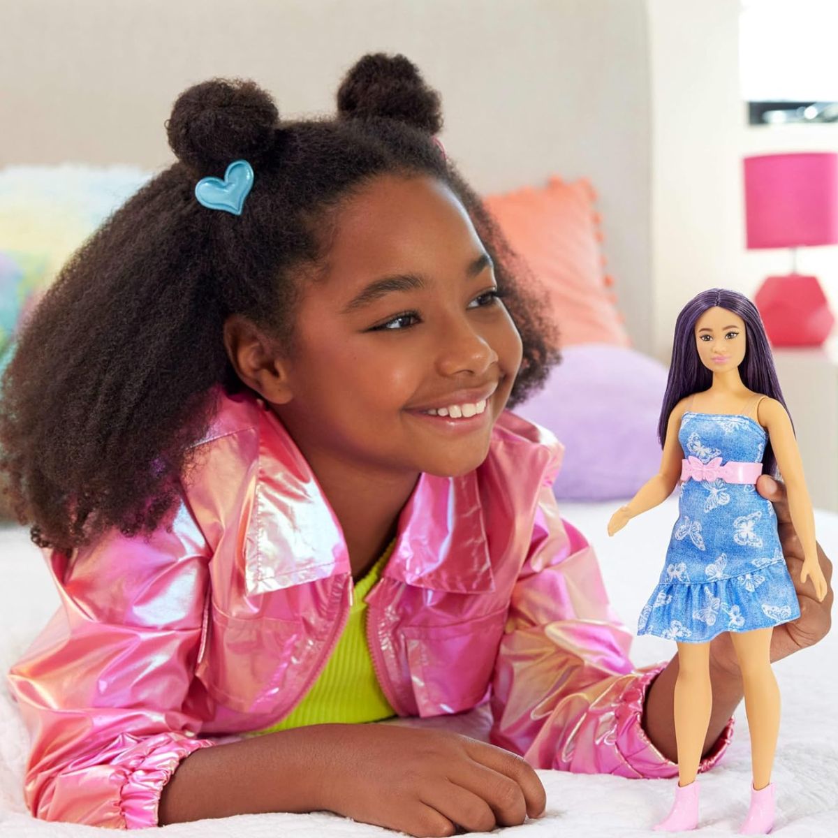 - This Barbie Fashionistas doll has a curvy figure and purple hair worn loose. She wears a strapless denim dress with a butterfly print, a pastel pink belt, and matching ankle boots for a fun, stylish look.