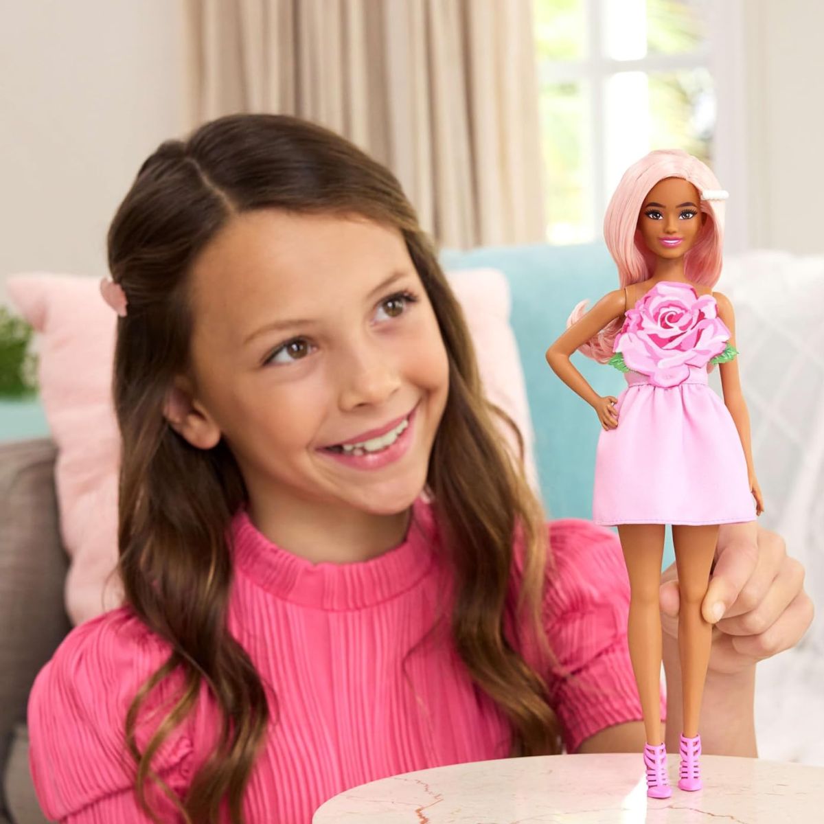 - This Barbie Fashionistas doll features a petite figure, pastel pink hair with a white barrette, and a strapless pink dress adorned with a rose detail. She completes her look with matching pink heels, ready for stylish fun!