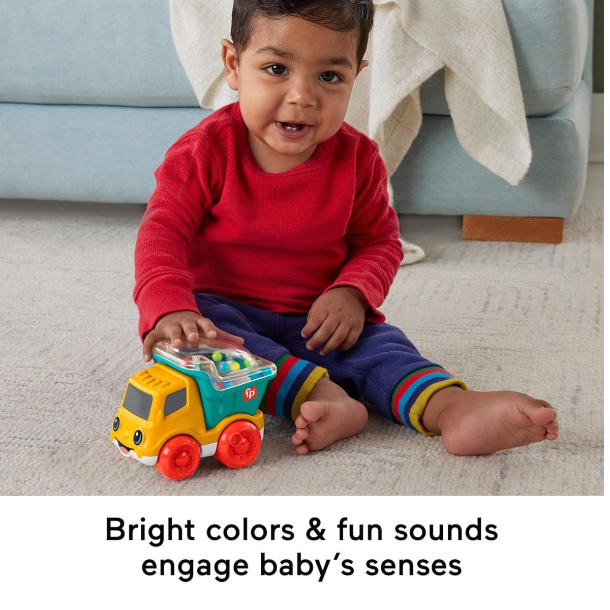 - Bright colors and sounds engage your baby’s developing visual and auditory senses