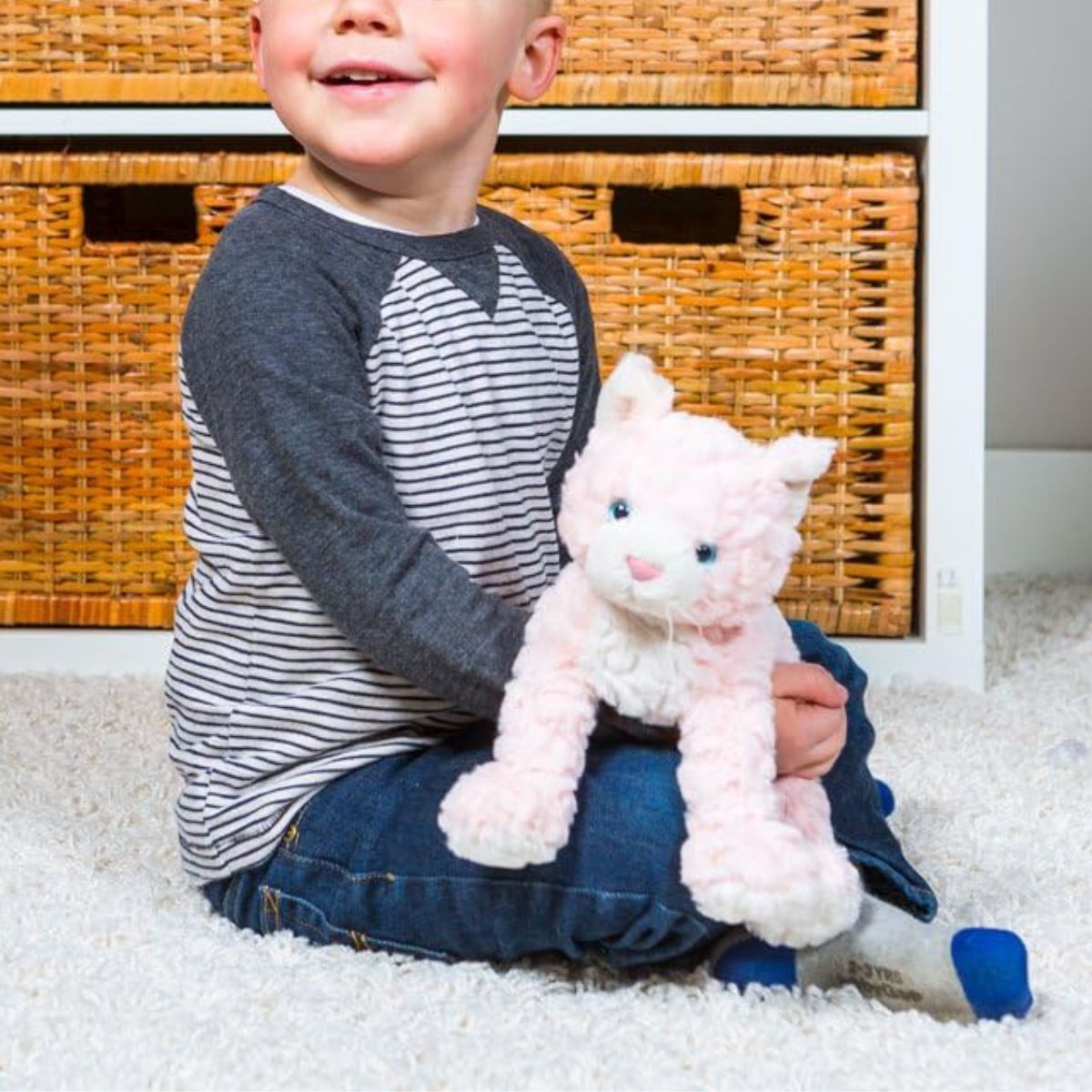 - This pink kitty has an embroidered smile, with a weighted bottom and feet for extra cuddly comfort—perfectly soft and sweet for little hands to cherish now and treasure for years ahead!