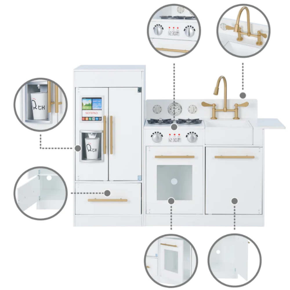 Designed to be just as chic as grown-up kitchens, this Little Chef Chelsea Play Kitchen is perfect for your little one’s bedroom or play area. Including one free-standing refrigerator and freezer unit and one separate free-standing oven, stovetop, and sink combination unit with an extendable countertop so your little one has plenty of space for food prep, Chelsea also comes with a cup and some pretend ice cubes. The fridge unit has a built-in pretend icemaker, while the kitchenette’s stovetop and oven has turning knobs that simulate the feel of real burners. A clean white finish and gold “hardware” ensure it seamlessly accents any room’s color scheme. It also makes a wonderful addition to the classroom! Teamson is a global lifestyle home designs brand bringing joy into every home through beautiful, quality pieces made for stylishly comfortable everyday living. Our Teamson Kids brands give flight to fun, discovery and learning through beautifully crafted, safe, and trend-right furniture pieces and toys for kids with a spirit of curiosity and adventure.