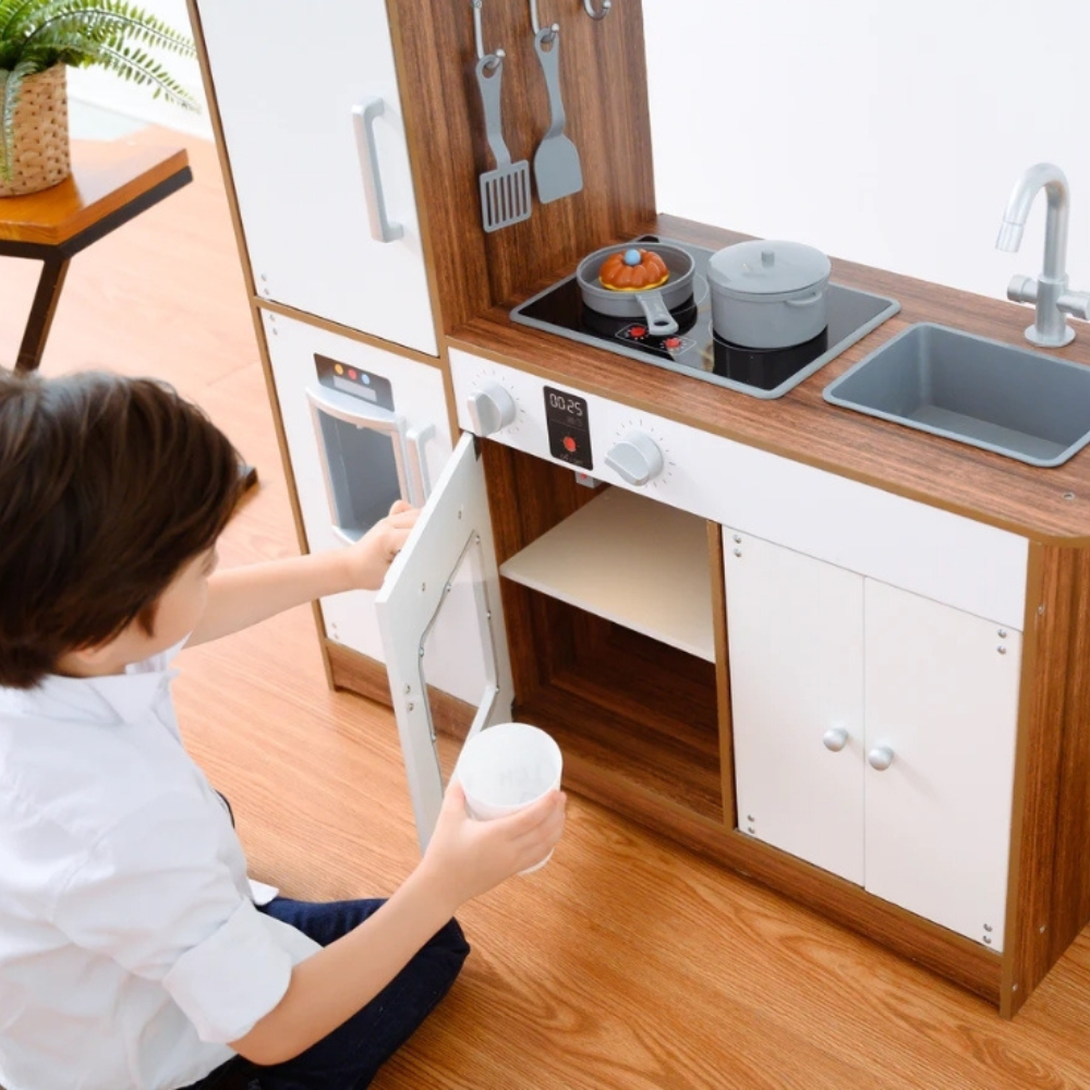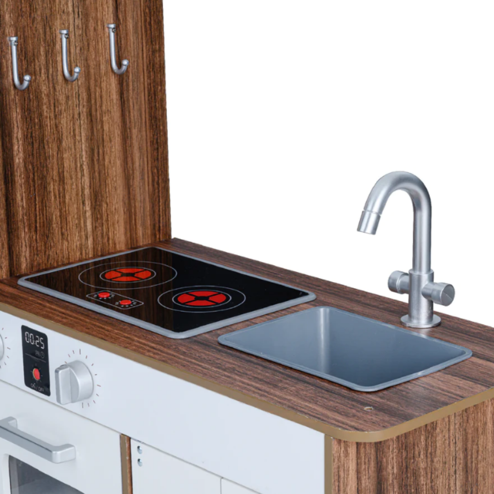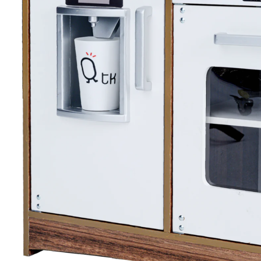 - Features openable doors, a refrigerator, 2 turning oven knobs, 2 induction burners with cooking noises, an ice maker, a sink, and a cabinet to enhance your little one's play time